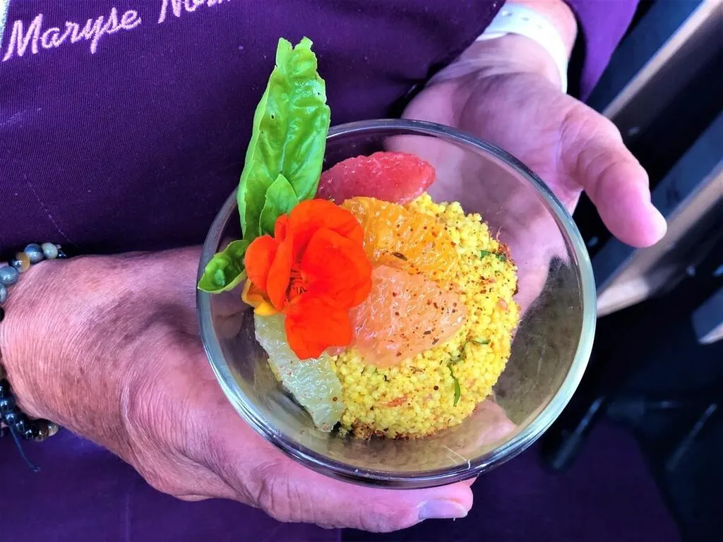 Une fois que la semoule a gonflé, il faut l’égrainer avec une fourchette ou ses doigts. Prendre la moitié des segments de fruits, du persil et du basilic et hacher l’ensemble « grossièrement ». Ajouter le tout à la semoule et mélanger avec 60 g d’huile de colza et du jus de citron. « Ça boit bien le taboulé », commente la cheffe. Enfin, mettre le mélange dans une verrine bien tassé et rajouter les segments de fruits sur le dessus. Touche finale : une fleur de capucine. « Ça a un goût poivré », prévient Maryse Normand en ajoutant une feuille de basilic et en saupoudrant d’un brin d’épices.