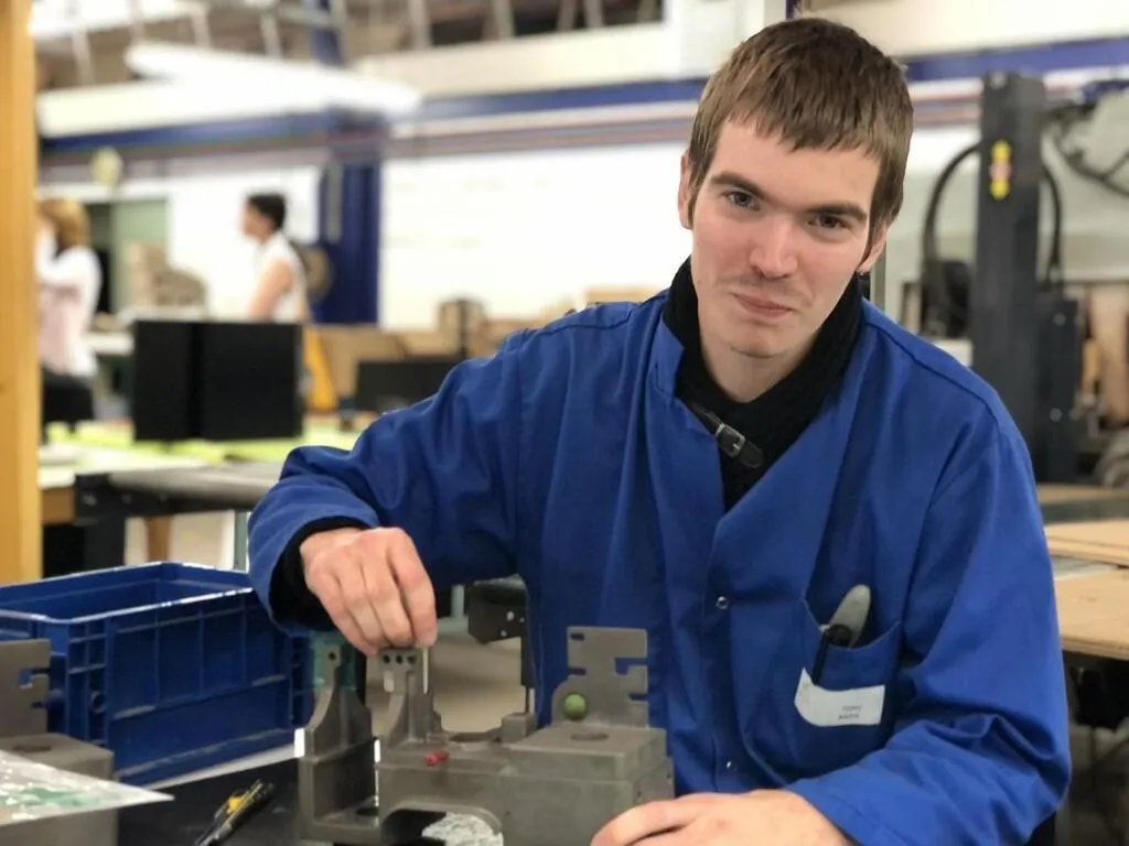 Tony Bazin, Flérien de 27 ans, travaille à l’Esat du Bocage. Il fait partie de l’atelier qui s’occupe de fabriquer des consoles en carton pour Charal. © Ouest-France