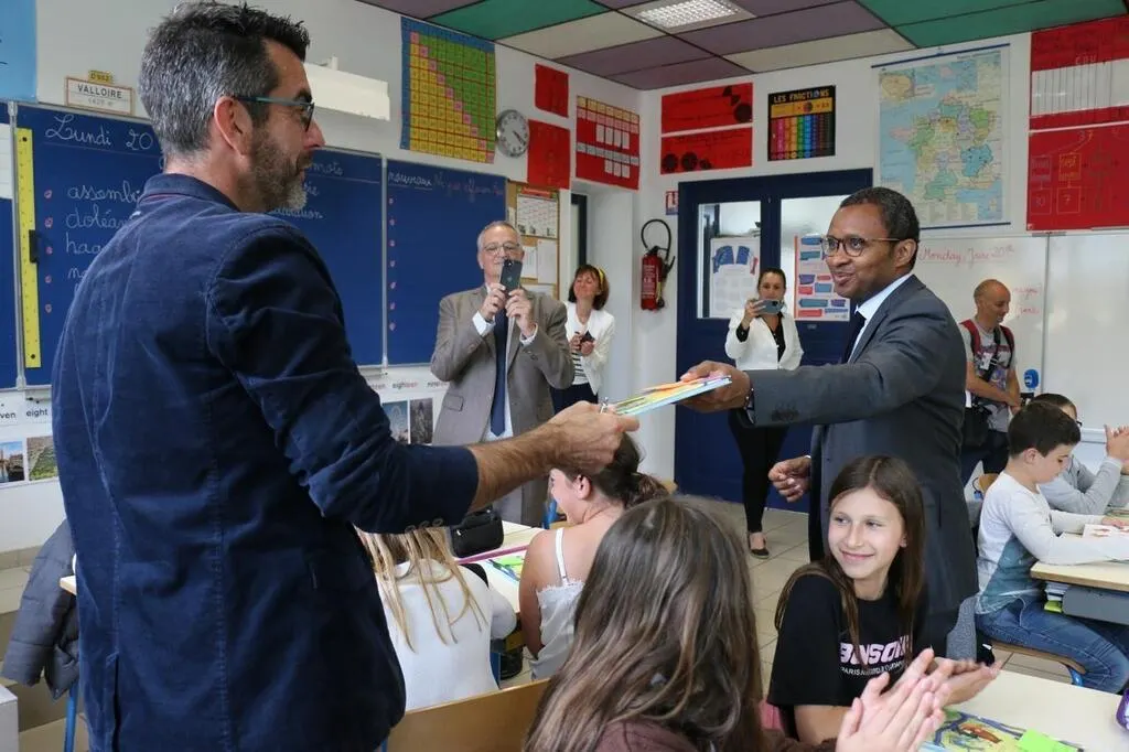 Pap Ndiaye, ministre de l’Éducation nationale, remet un recueil de fables de La Fontaine au directeur de l’école de Sainte-Gauburge-Sainte-Colombe, dans l’Orne, où il était lundi 20 juin 2022. © Ouest-France