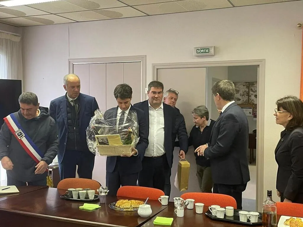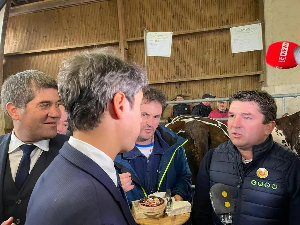 Charles Deparis, producteur laitier AOP pour la marque Gillot, a fait goûter du camembert à Gabriel Attal, en visite ce lundi 25 novembre 2024, à la foire de la Sainte-Catherine de Briouze, dans l’Orne. © Ouest-France