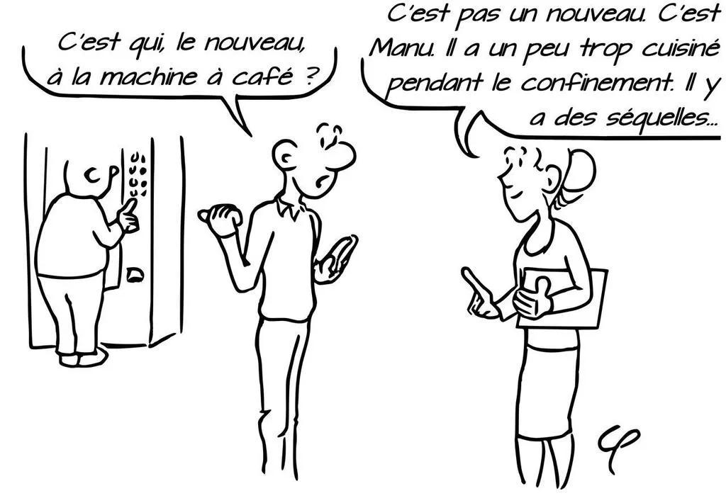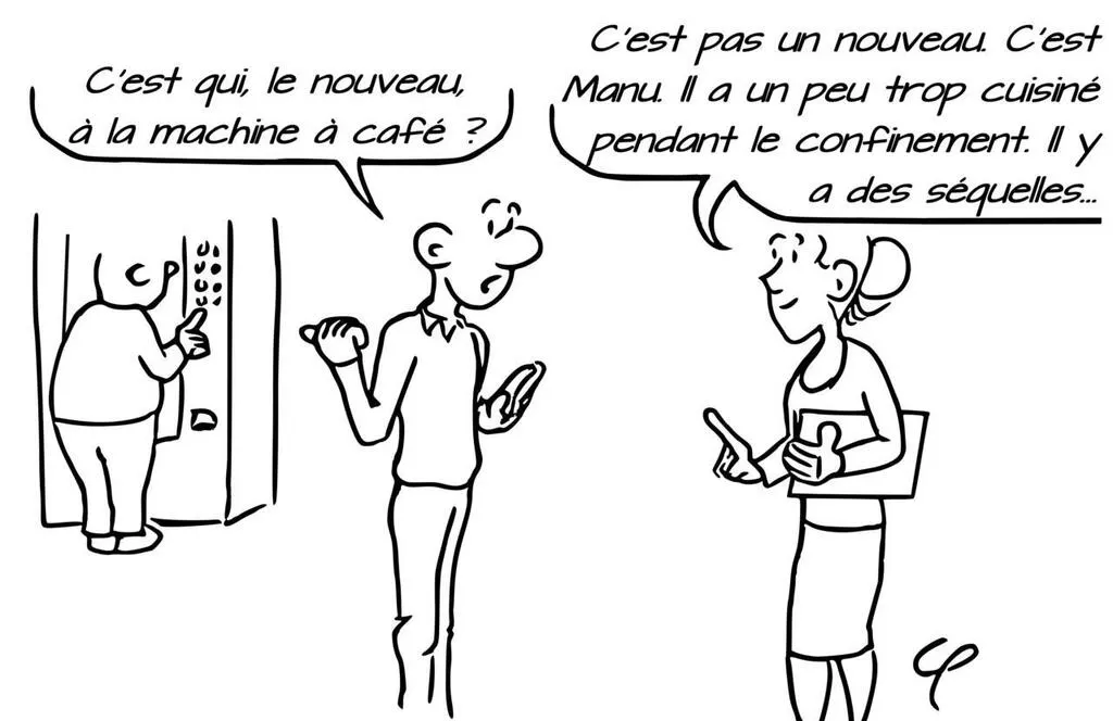 Le père Christophe Peschet a croqué, pour la chronique de frère Manu, la passion du Salésien pour la cuisine. Et ses possibles séquelles post-confinement. © Christophe Peschet
