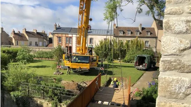 Mercredi 29 mai, une nouvelle étape importante a été franchie avec la pose d’une passerelle au-dessus de la Briante, entre le jardin expérimental, situé rue Balzac, et la cour du château.