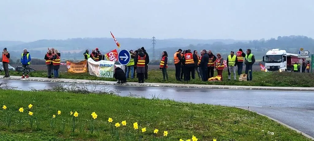 Les unions locales CGT de Mortagne-au-Perche dans l’Orne, de La Ferté-Bernard en Sarthe et de Nogent-le-Rotrou dans l’Eure-et-Loir ont mis en place un barrage filtrant jeudi 6 avril, dès 6 h 45 à Val-au-Perche dans l’Orne. © Ouest-France