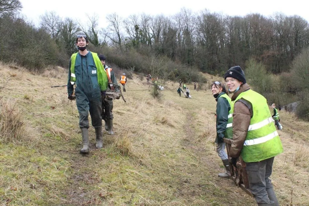 En arrivant au coteau du Champ des Noyers à Guerquesalles (Orne), mardi 1er février 2022, en après-midi, trente-sept jeunes étudiants en Brevet de technicien supérieur agricole (BTSA) Gestion de protection de la nature (GPN), au lycée agricole de Sées, s’y affairent depuis 8 h 30, le matin. Ce chantier d’entretien et de nettoyage s’inscrit dans le cadre d’un projet pédagogique conduit en partenariat avec le Conservatoire des espaces naturels de Normandie, propriétaire de ce site de près d’un hectare et demi.