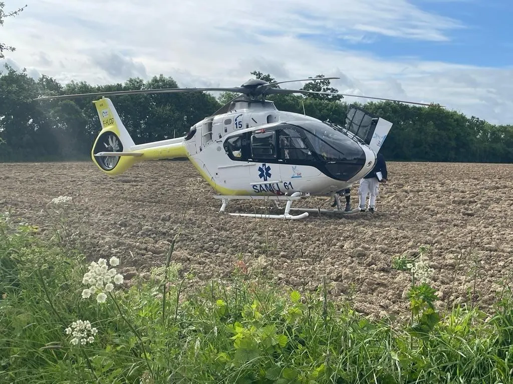 Tombant sur l’outil qui était en fonctionnement, l’homme a été très grièvement blessé au niveau de l’abdomen. Il a été pris en charge par les pompiers et par le SMUR de l’Orne.  Il a été évacué par hélicoptère vers le Centre hospitalier universitaire (CHU) de Caen avec un pronostic vital engagéÂ