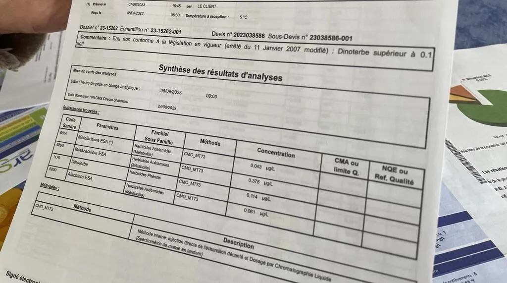 Résultat de l’analyse commandée par un habitant de Gandelain : trois résidus de pesticide et un pesticide ont été trouvés dans son eau du robinet. © Ouest-France
