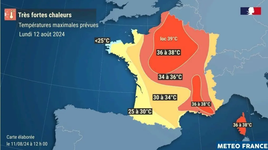 De très fortes chaleurs sont annoncées sur la France pour la journée de lundi 12 août 2024. capture d’écran Météo France