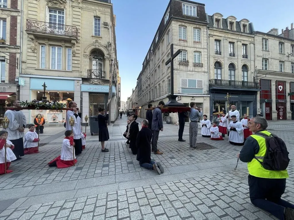 Les fidèles de la Fraternité Saint-Pie X (FSSPX) prennent la rue, à Caen, le 1er avril 2025, pour protester contre une pièce qu’ils jugent "blasphématoire" et qui est programmée au Théâtre de Caen, le soir même. © Ouest-France