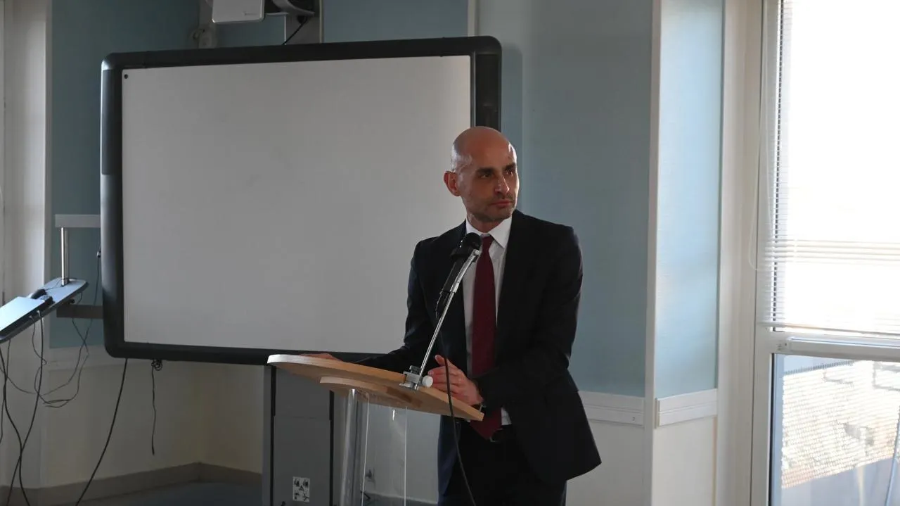 Damien Dumont, le directeur général adjoint du CHU de Caen, a évoqué les sujets importants de l’hôpital falaisien lors des vÅ“ux aux agents mardi 6 janvier 2026. © Ouest-France
