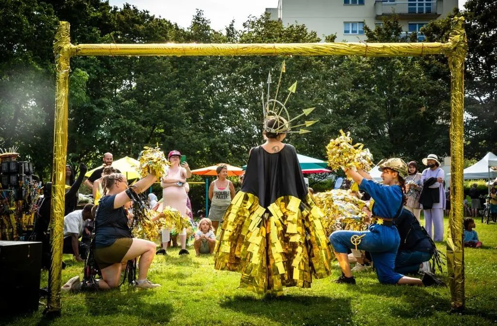 Après le lancement des concerts du dimanche, voilà le théâtre des samedis après-midi de juillet. La compagnie Bonne chance, dirigée par Maxime Gosselin, choisie par le service culturel, est implantée à Caen. Les artistes se consacrent à des spectacles multidisciplinaires mêlant la fête, le futur et le théâtre et convoquent la joie en abordant des sujets cruciaux, tels que l’urgence écologique, l’action citoyenne ou la transmission aux futures générations ».