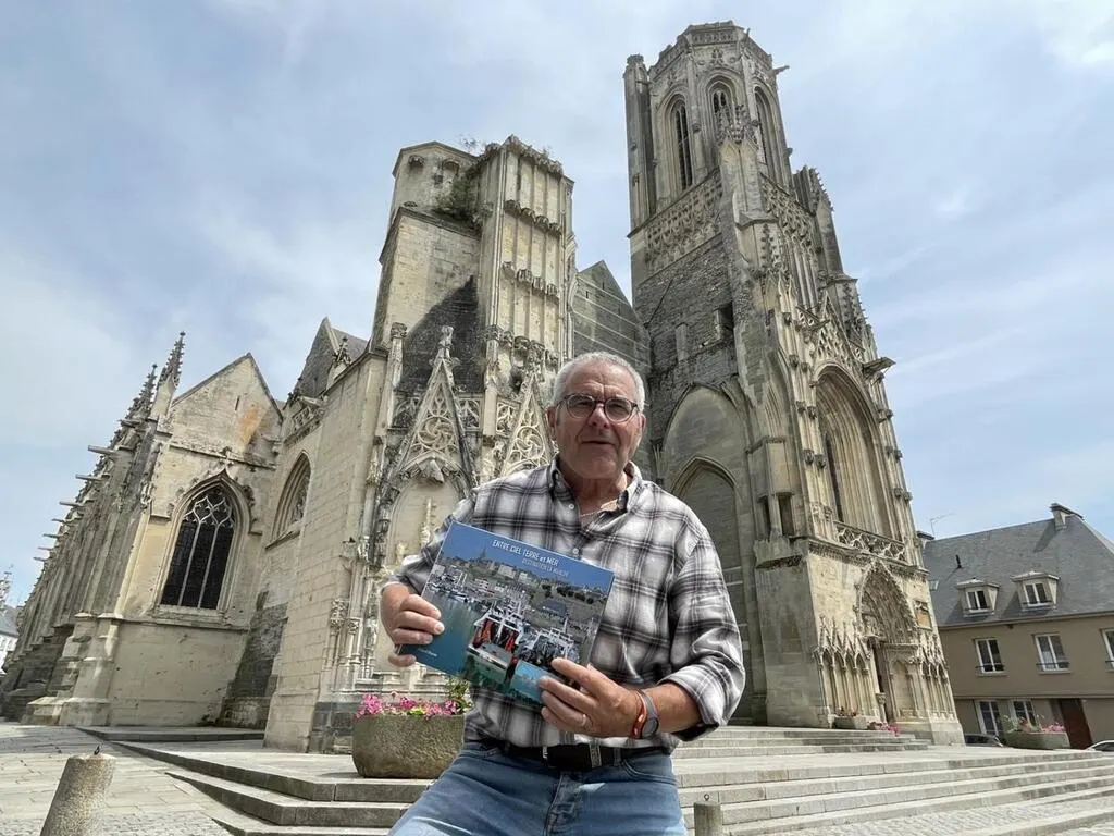 Richard Brionne devant l’église Notre-Dame de Saint-Lô qu’il évoque dans son livre « Entre ciel, terre et mer, destination la Manche ». © Ouest-France