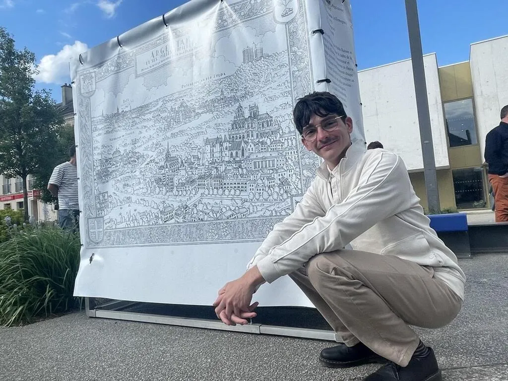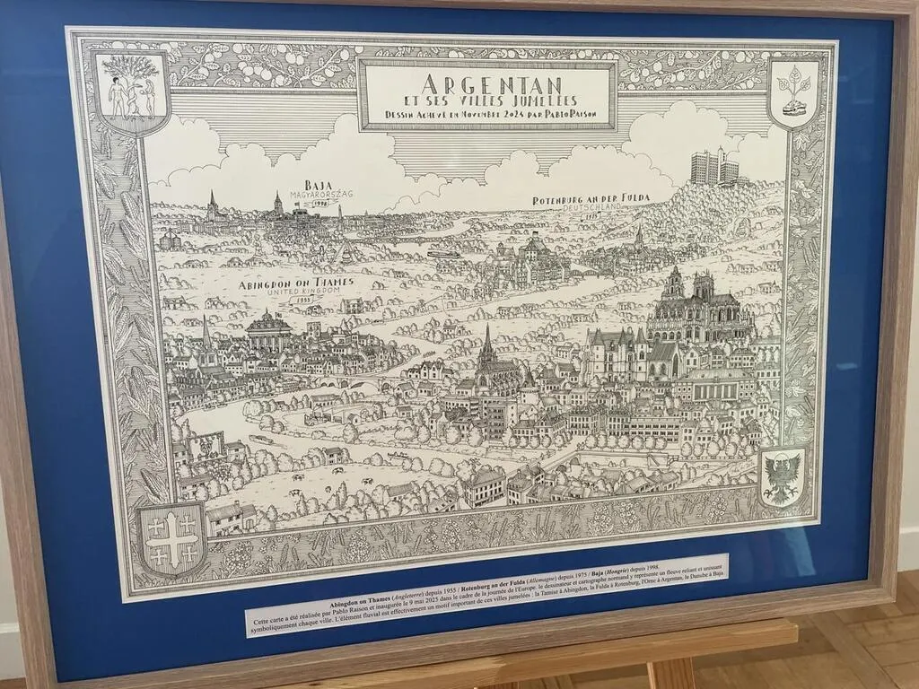 Pablo Raison, 24 ans, artiste dessinateur originaire de l’Orne, a dévoilé une nouvelle carte dont il a le secret, vendredi 9 mai 2025, pour la Journée de l’Europe. Il y a représenté Argentan et ses trois villes jumelles : Baja, Rotenburg et Abingdon. Cette carte est observable sur le parvis de la mairie.