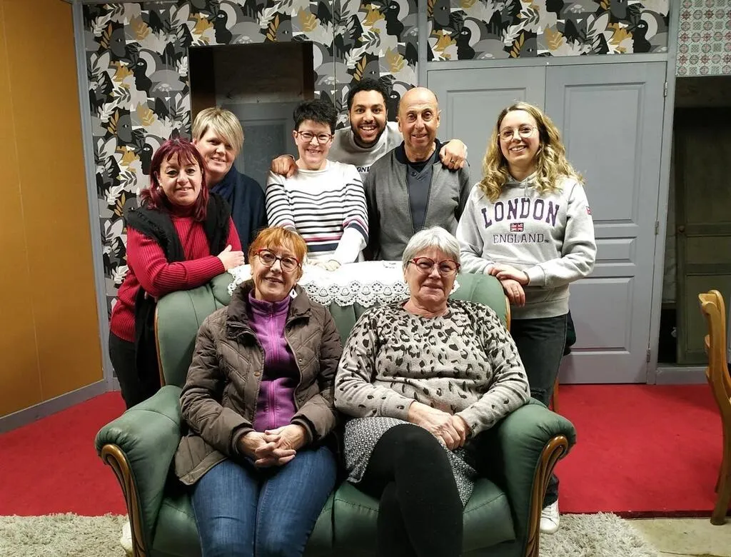 Assises : Marie-Claude et Danielle. En haut à gauche : Nadine, Karine (souffleuse), Isabelle, Maxime, Patrice et Élise font partis de la troupe des Amis du théâtre de Putanges. Samedi, ils vont interpréter leur nouvelle pièce « L’héritage de tata Odette » de Jérôme Dubois, à la salle Jean-Féron, de Putanges. © Ouest-France