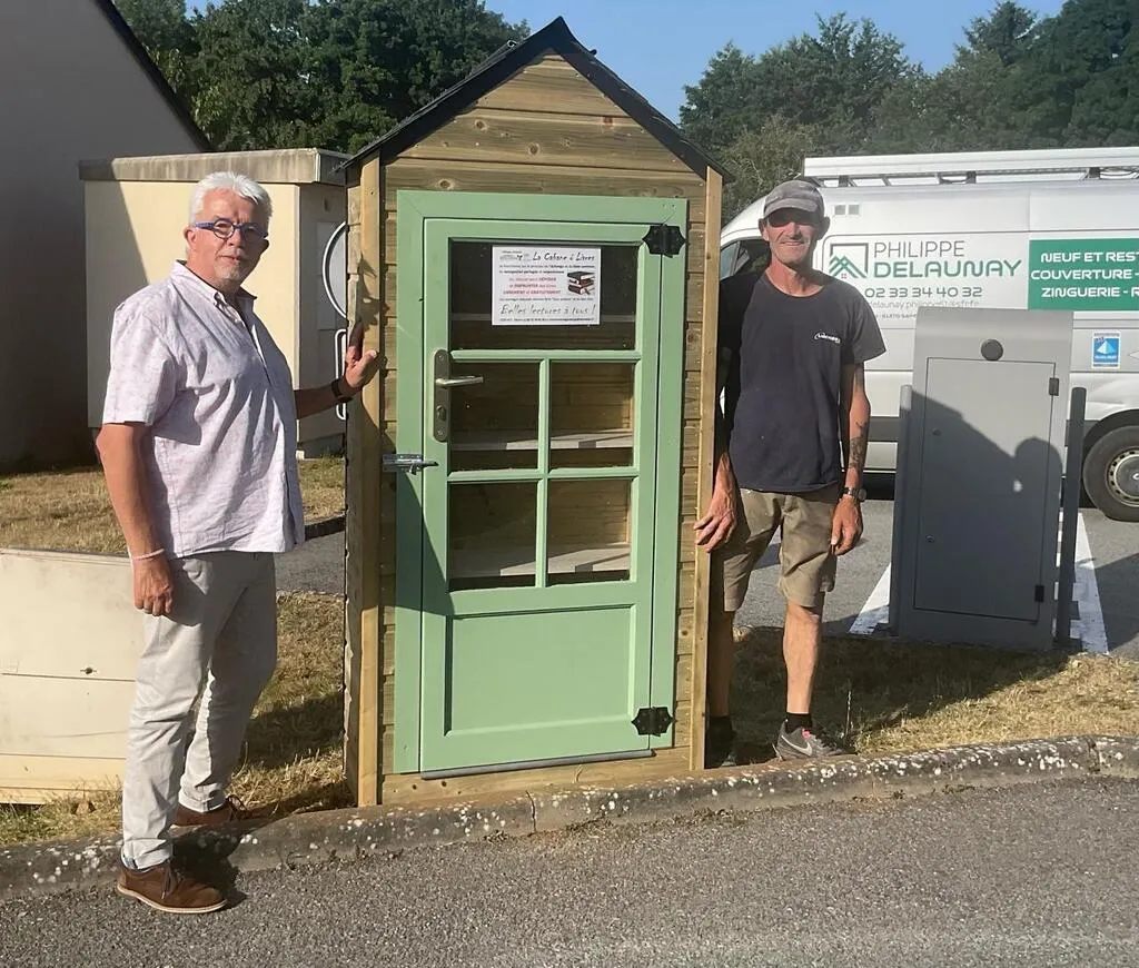 La Cabane ô livres, présentée par Philippe Delaunay, artisan qui l’a fabriquée, et le maire, Philippe Bigot. © Ouest-France