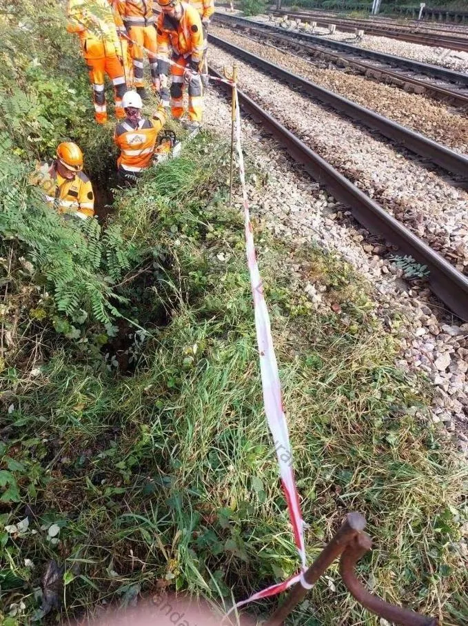 Le glissement de terrain qui a eu lieu à Saint-Cyr (Yvelines) le 11 octobre 2024 doit conduire à d’importants travaux sur la ligne SNCF Paris-Granville, samedi 26 et dimanche 27 octobre 2024. La circulation sera impossible de Dreux jusqu’à Paris-Montparnasse. © SNCF