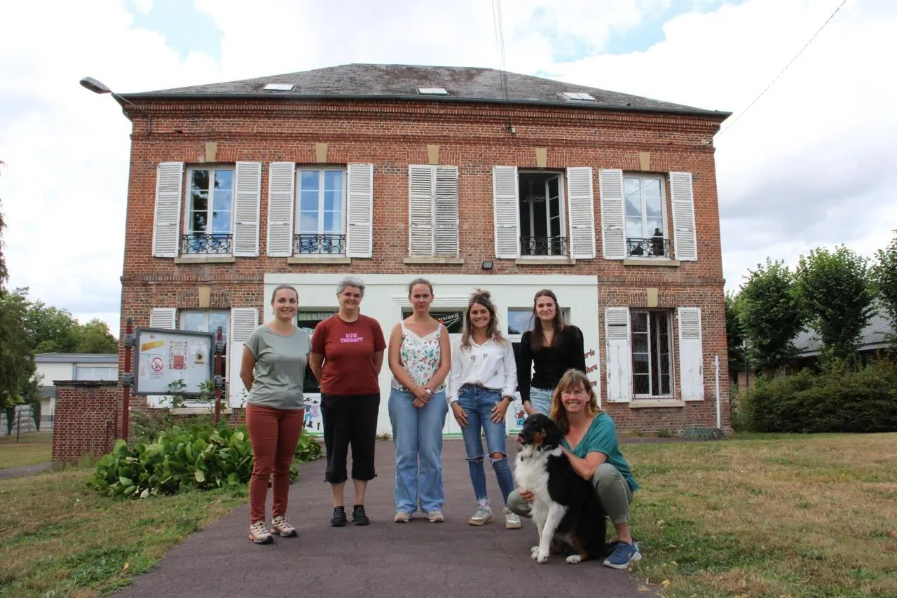 De gauche à droite : Marie Tessier (présidente), Valérie (secrétaire comptable), Marie (animatrice), Anaïs (directrice du centre de loisirs), Océane (animatrice), Laëtitia (directrice) et Phoenix, la mascotte avec en arrière-plan la MJC, appelée à disparaître avant la fin de la saison. © Ouest-France