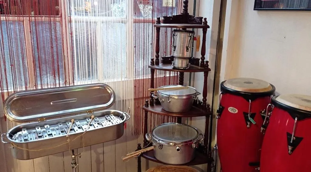 Depuis la fin février 2025, Jean-Claude Roche et sa compagne Kate exposent leurs passions respectives, les percussions et la couture, dans un charmant espace, Rue des antiquaires à Domfront (Orne).
