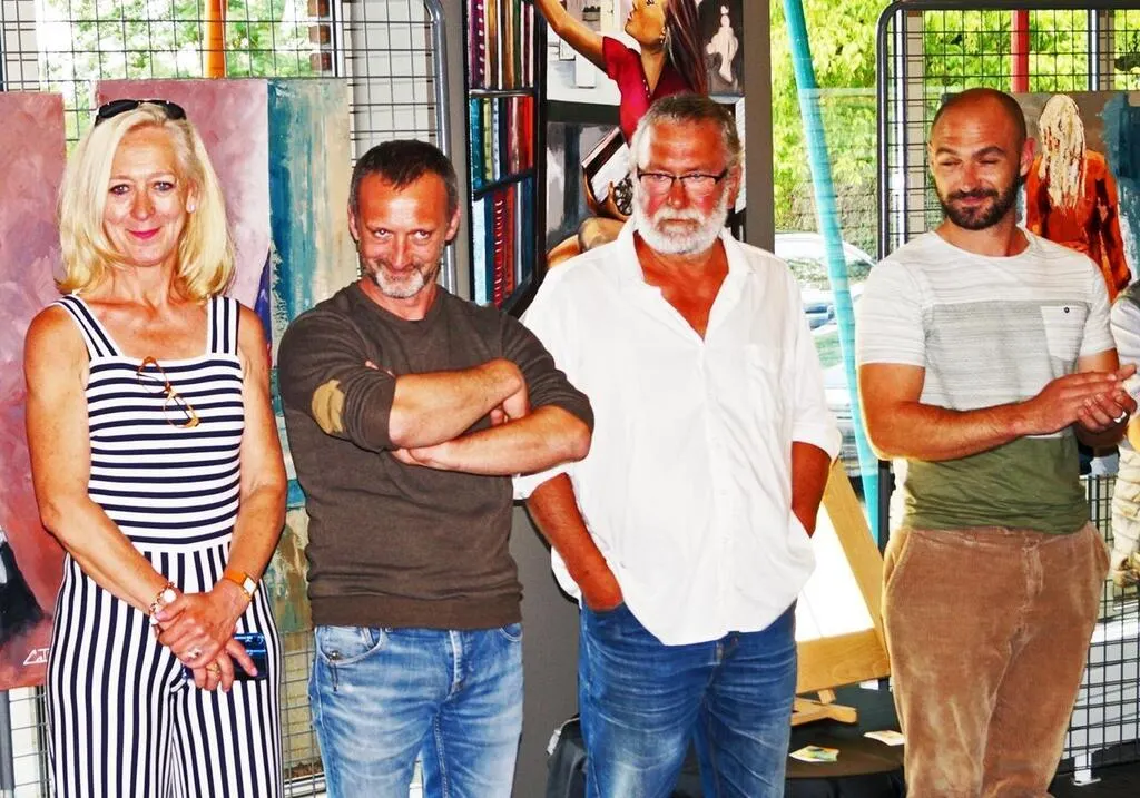 Philippe Degrenne, entre ses deux fils, Johann et Raphaël, et Catherine, sa sÅ“ur, lors du vernissage de l’exposition de 2018. © Archives Ouest-France