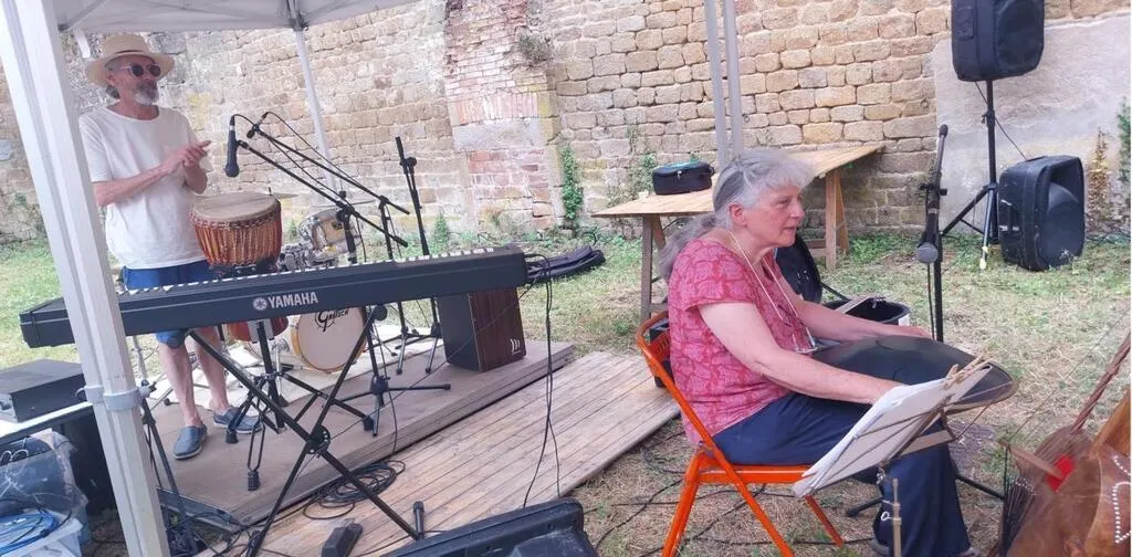 Pascale Rapeaud, musicienne et Joël Pellegrini, musicien et compositeur caennais, ont présenté différents instruments de musique dans la cour de la maison de Marcel Pierre. © Ouest-France