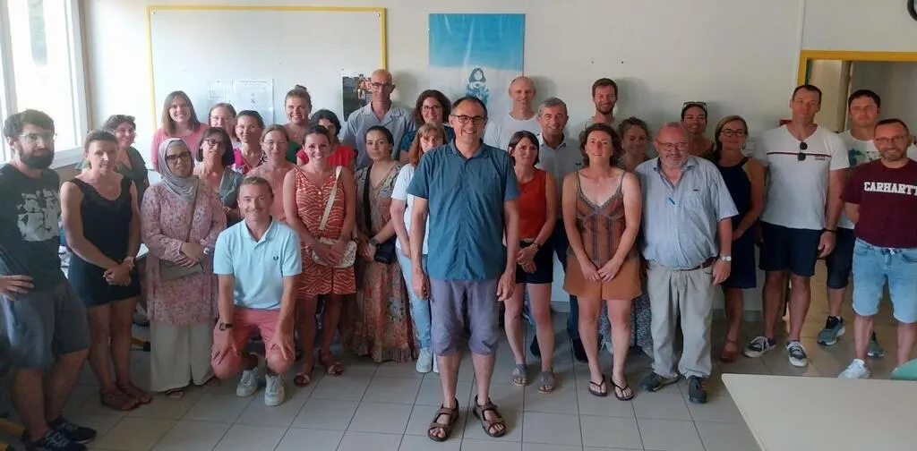 Au centre, Éric Gilardi, directeur des écoles, entouré des enseignants actuels et anciens, de la communauté éducative, ainsi que du maire, Michel Leroyer, et d’Olivier Breuil, adjoint chargé de l’éducation. © Ouest-France