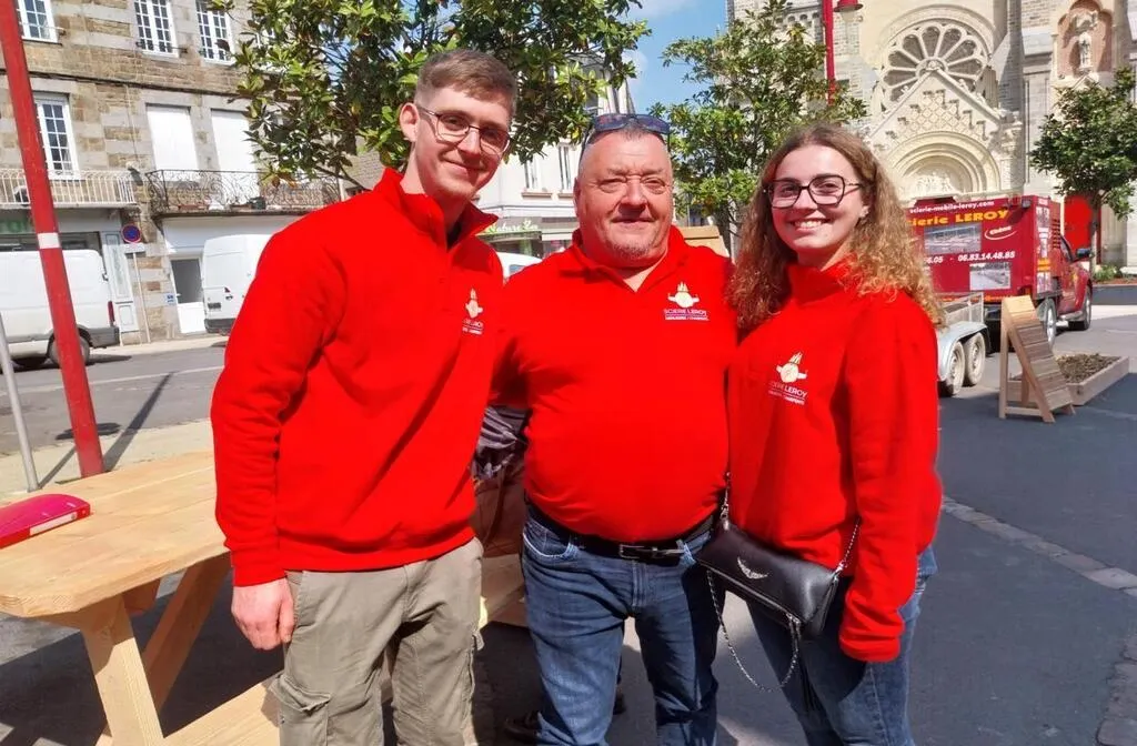Les représentants de la scierie Leroy du Grais : Théophane, Jean-Christophe Leroy et Léa Ledan exposaient pour la première fois des abris et mobilier de jardins. © Ouest-France