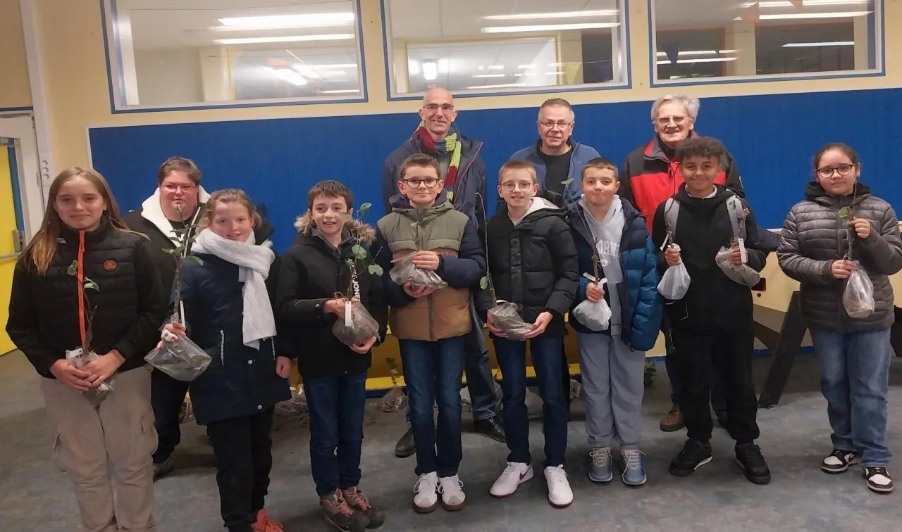 En présence de leur enseignant, Sylvain Houllier, Serge Babarit et Raymond Legeard, membres des Croqueurs de pommes, ont remis le plant greffé à chaque ancien élève et ont prodigué leurs conseils pour la plantation dans leur jardin familial : Préparer le plant, effectuer un trou de 30 cm sur 30 cm, l’entourer de terreau et ne pas arroser aussitôt pour éviter le gel.