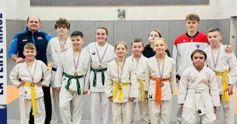 Les jeunes karatékas ont obtenu de bons résultats au championnat de l’Orne. Notamment grâce à la présence de Maël 17 ans, au 2e rang à droite, qui évolue à très haut niveau. Il a reçu une aide de 500 € du club de karaté, afin de l’aider dans ses déplacements. À gauche, leur entraîneur, Yann Auffret. © Ouest-France