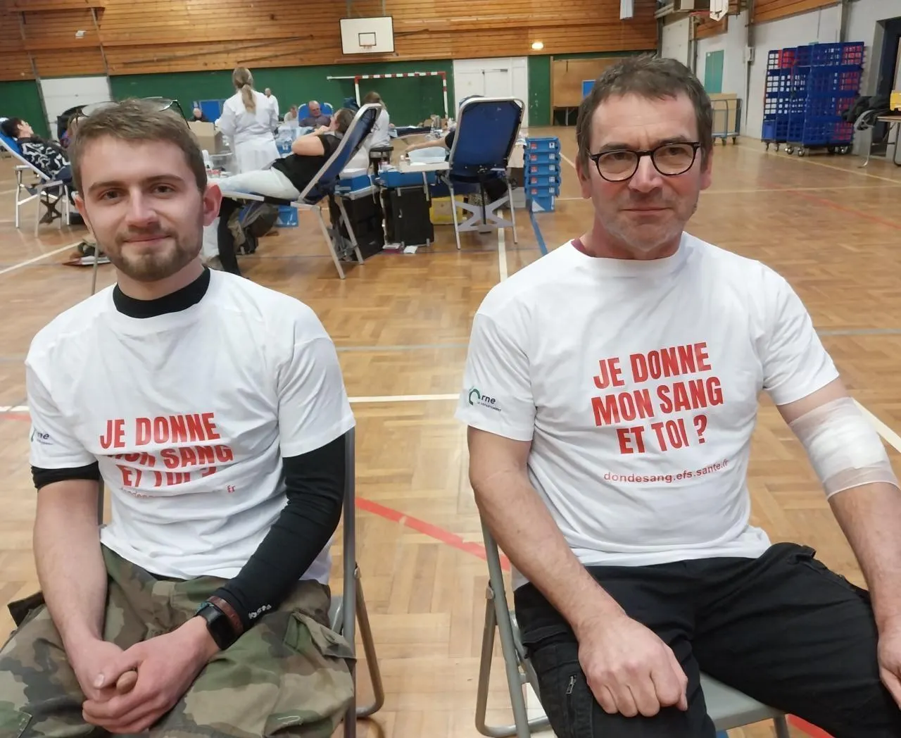 Deux nouveaux donneurs, Baptiste, agriculteur à Fleuré, 21 ans, est venu donner son sang et Bruno, 50 ans, salarié dans une entreprise fertoise, a aussi franchi le pas. © Ouest-France