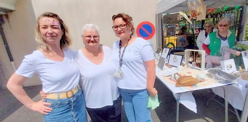Au centre, Chantal Dauphin, présidente de l’association des personnes âgées de l’hôpital, et les deux animatrices, Aurélie Bisson (à droite) et Lucie David(à gauche). À droite, un stand d’objets. © Ouest-France