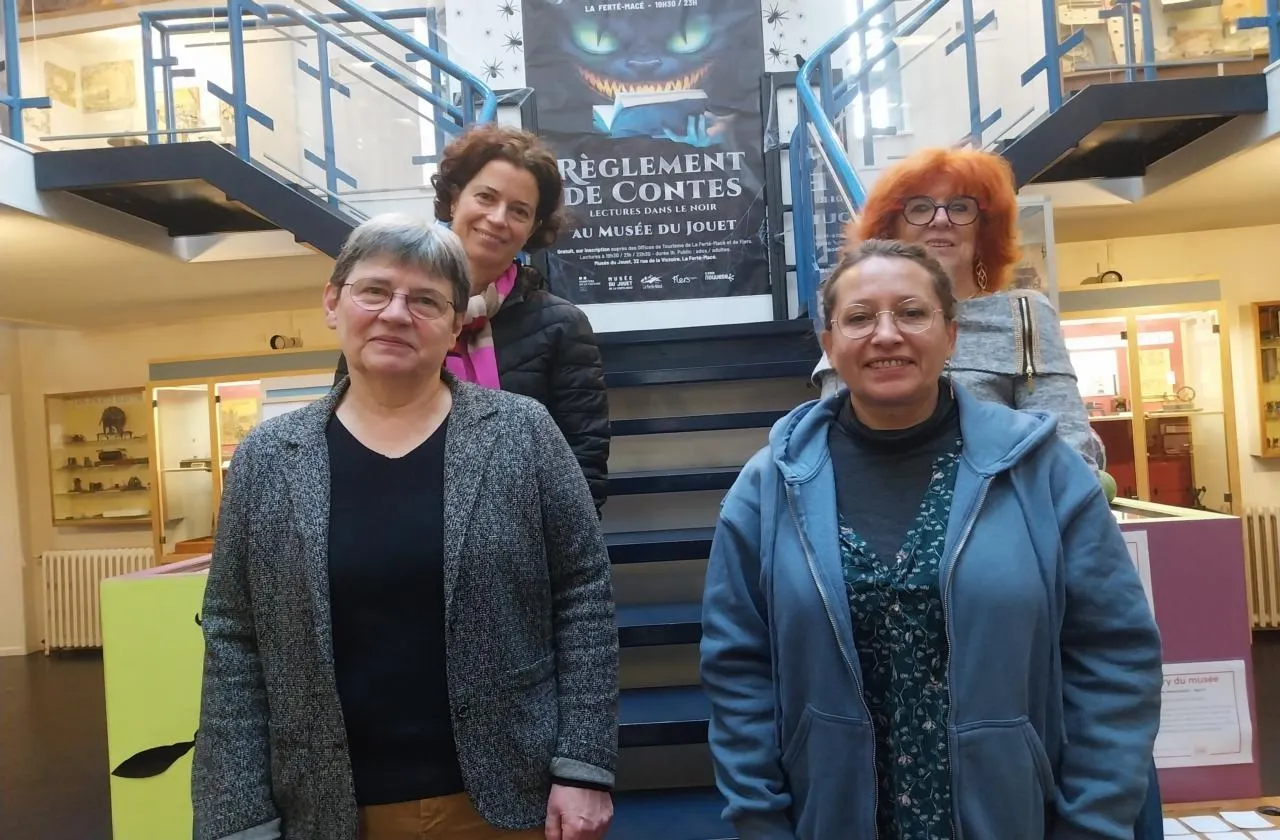 Au premier rang : Sylvie Errard, adjointe chargée de l’attractivité et de la communication, et Valérie Bothé, animatrice à la médiathèque. Au second rang : Antigone Georgalas, représentant le groupe de conteurs, et Joëlle Tanguy, adjointe chargée de la culture et des loisirs. © Ouest-France
