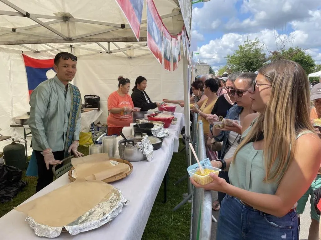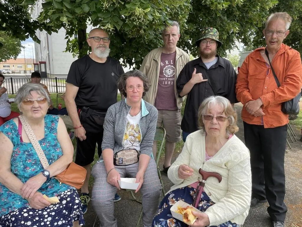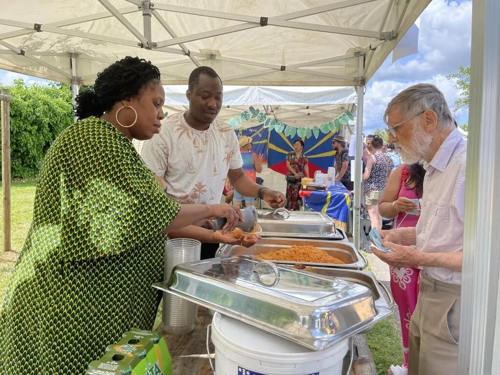 À l’heure du déjeuner, les effluves de mets épicés se mélangent et les files d’attente se rallongent autour des stands de nourriture des quatre continents. « Je suis venu voir s’il y avait du couscous, et oui il y en a ! C’est mon plat préféré », explique un retraité de Courteille, devant la table de l’association Solidarité avec les réfugiés où il paiera son assiette trois euros. « On mange africain ! », décide une jeune femme en attirant son groupe de l’autre côté du square des pommiers, choisi cette année pour l’événement.