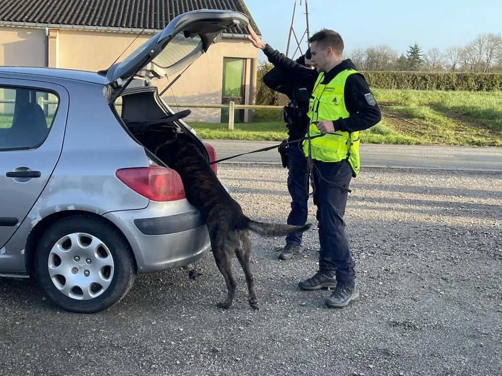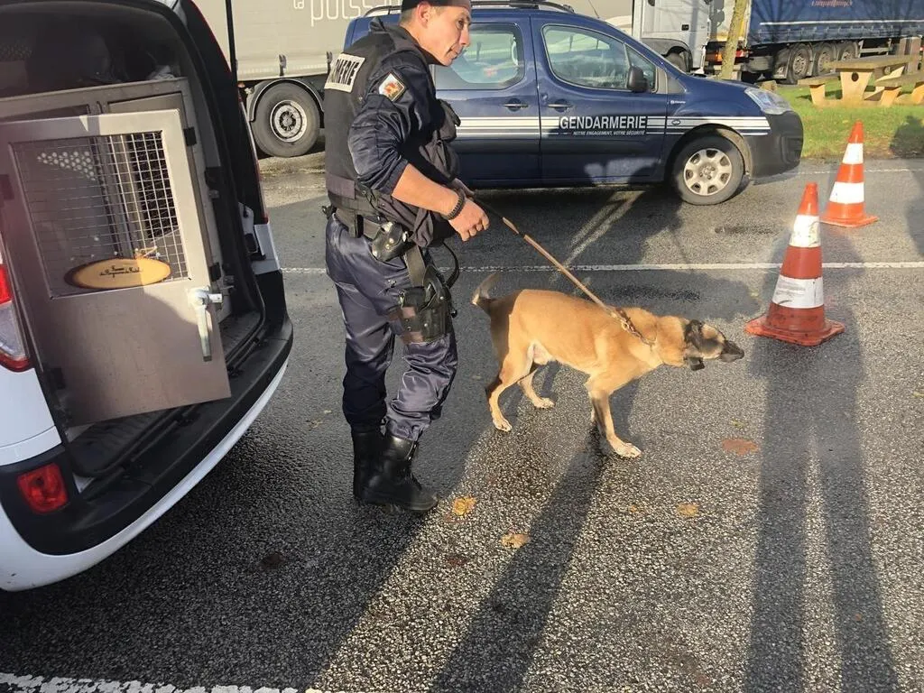 Les trois maîtres-chiens de la gendarmerie de l’Orne et leurs animaux (ici celui d’Argentan lors d’un contrôle à Giel en avril 2024) seront réunis à Argentan, fin 2025. © Archives Ouest-France