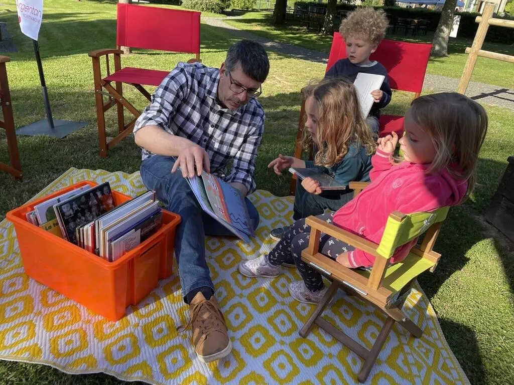 Emmanuel "Manu" Plaçais a lu des histoires à Emma, Diane et Sylvain à Saint-Brice-sous-Rânes. © Ouest-France