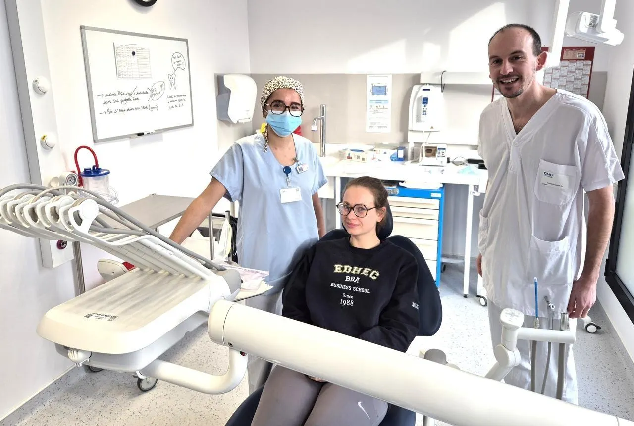 Andréa Ribeiro, étudiante en chirurgie dentaire, et Romain Jacq, chef du nouveau service de formation O + à Rouen (Seine-Maritime), avec leur patiente, Marie. © Ouest-France