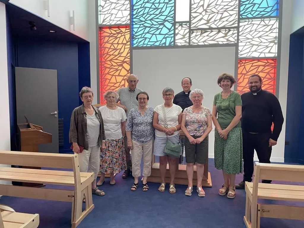 Les premiers bénévoles de la paroisse qui ont visité la nouvelle maison paroissiale en compagnie des pères Pierre-Yves Émile et Pierrick Harivel lundi 23 juin. © Ouest-France