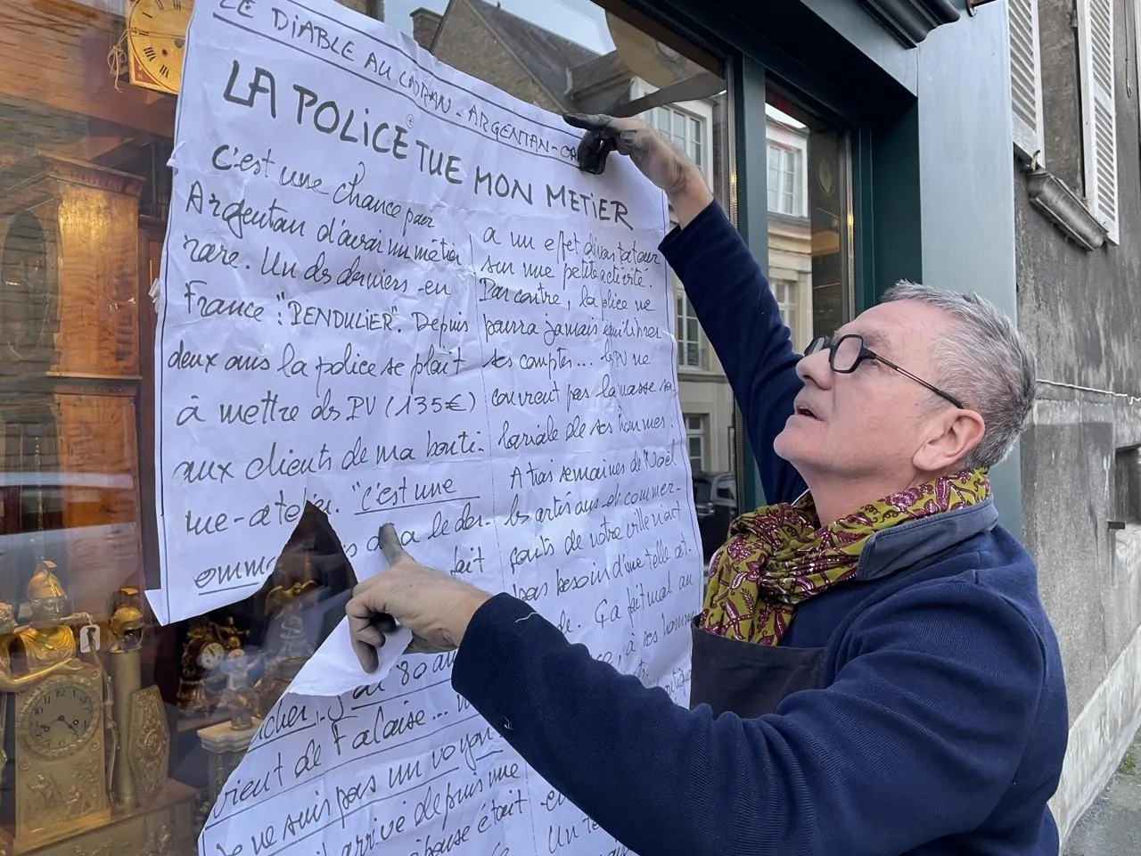 En colère contre la police nationale qui verbalisait ses clients en centre-ville d’Argentan (Orne), le pendulier Jean-François Lefèvre avait apposé une affiche virulente. Il l’a retirée après une semaine car le dialogue s’est instauré.