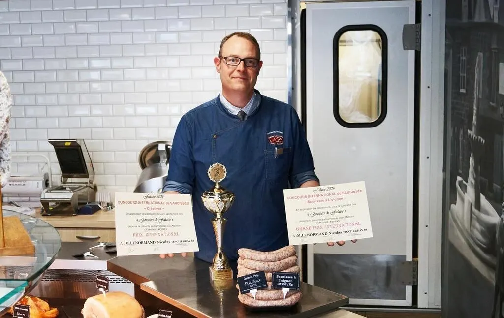 Le boucher de Tinchebray-Bocage, Nicolas Lenormand, a reçu deux prix, lundi 13 mai 2024, après sa participation au concours de saucisses de la confrérie des Goustiers de Falaise, organisé en avril.