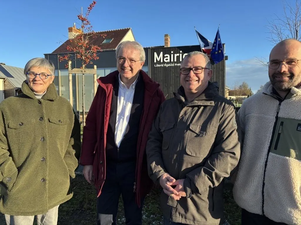 Laurent Noé (deuxième en partant de la gauche), présente sa candidature pour les municipales à la mairie d’Arçonnay (Sarthe). Il est accompagné d’autres élus sortants : Nadine Kiers-Perrault, Jessy Cocherel et Fabrice Voineau. © Ouest-France