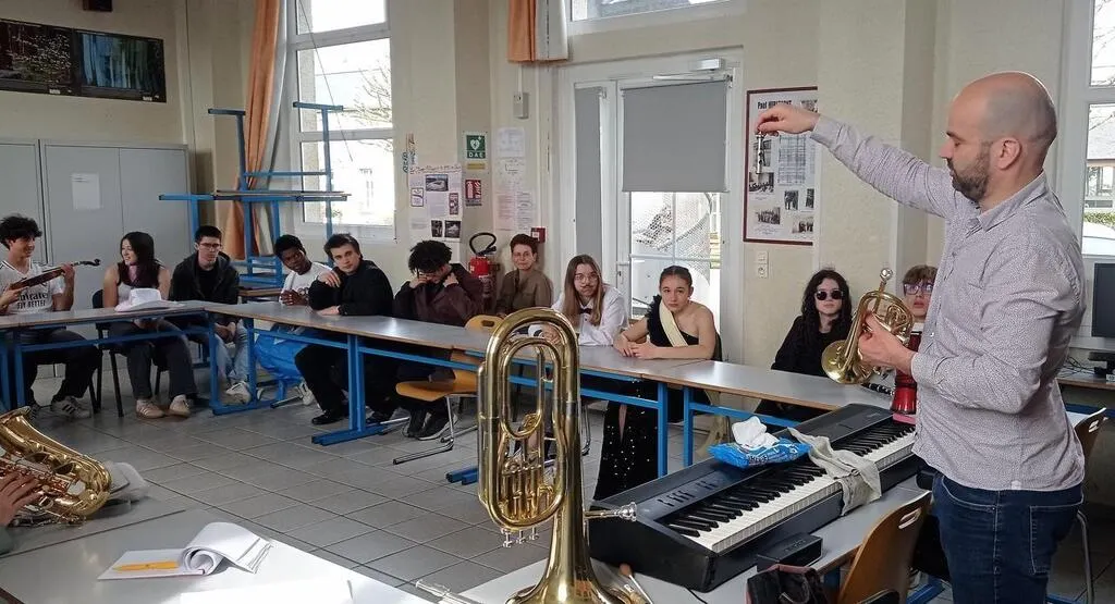 Mathieu Braud, chef d’orchestre, venu rencontrer les lycéens d’Auguste-Chevalier pour leur parler de l’opéra et, notamment, leur présenter les différents instruments utilisés. © Ouest-France
