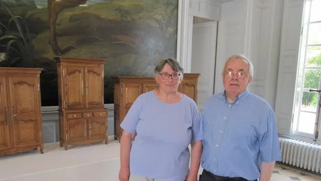 Norbert Guerin et son épouse devant quelques meubles miniatures présentés dans le grand hall du château. © Ouest-France