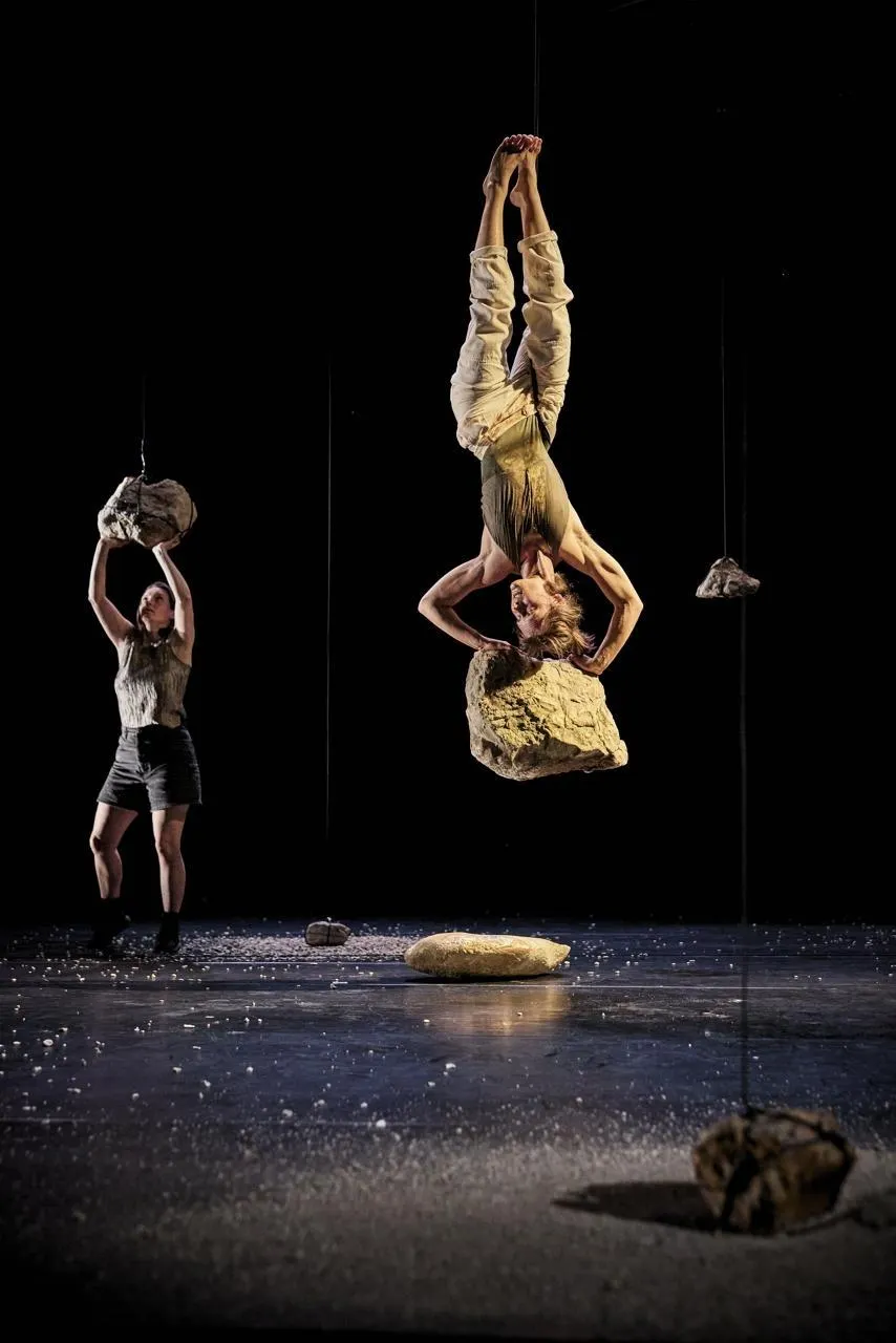 Lors d’un laboratoire, nous avons suspendu des pierres, en observant le contraste entre lourdeur des minéraux et apparente légèreté en suspension, menace imminente d’un effondrement. En travaillant avec des cailloux, nous avons vite appris la nécessité de collaborer : être plusieurs pour pouvoir les déplacer, avec des stratégies. Les gestes, les chorégraphies pour ces actions simples - porter, déplacer, nettoyer, suspendre les pierres - ont été un de nos points de départ pour l’écriture de la pièce.