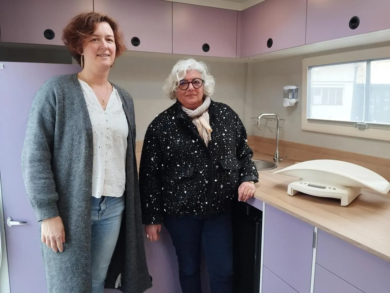 Angélique Duguey, infirmière puéricultrice, et Annie Teissier, cadre territorial de santé, à l’intérieur du véhicule aménagé. © Ouest-France