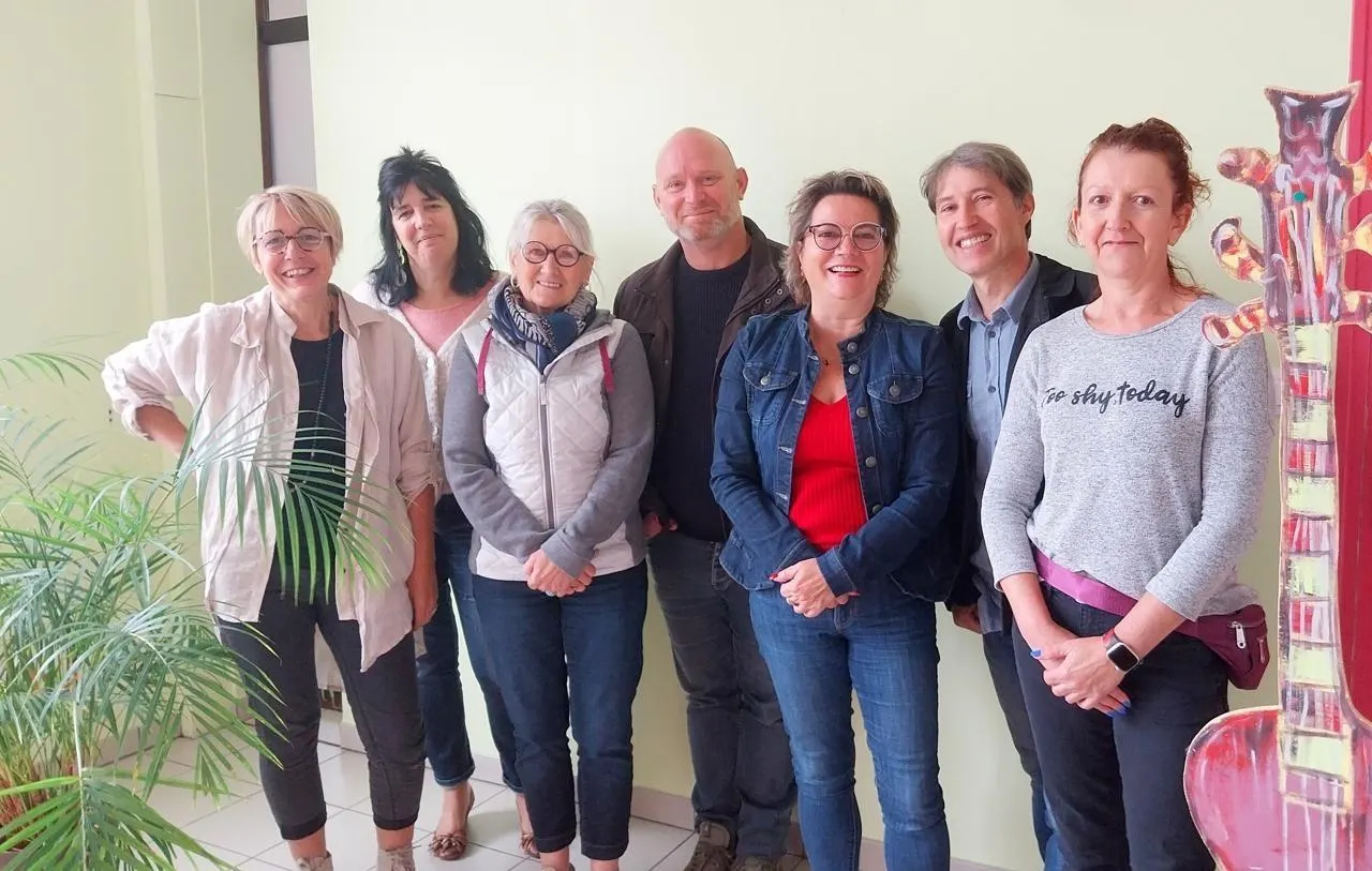 Les animateurs des activités artistiques, à partir de la gauche : Perrine Lemée ; Christelle Tribouillard, la directrice ; Véronique Clémenté, adjointe chargée des affaires sociales ; Thomas Boutigny ; Manuela Chevalier ; Franck Karren ; et Marilyne Journault. Snejana Briard et Richard Berry absents sur la photo. © Ouest-France