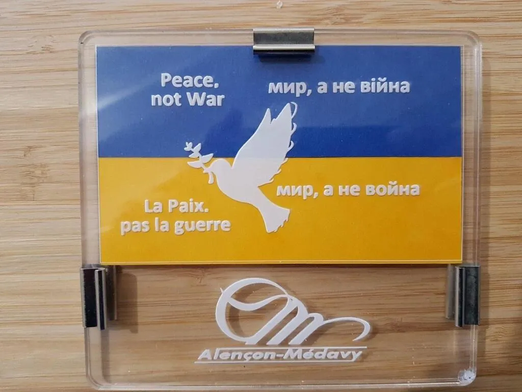 Ce cadeau fabriqué par Rémy Vannier a également été offert à la famille ukrainienne. Il comporte le message principal en quatre langues, au-dessus du visuel Alençon-Médavy. © DR