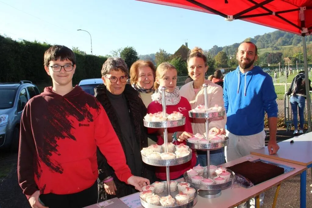 De gauche à droite : Tom, Nicole Yvard-Chesneau, Yvette Thommerel, Emma, Laëtitia Dominguez et Olivier Benoist devant des petites douceurs aux couleurs d’Octobre rose. © Ouest-France