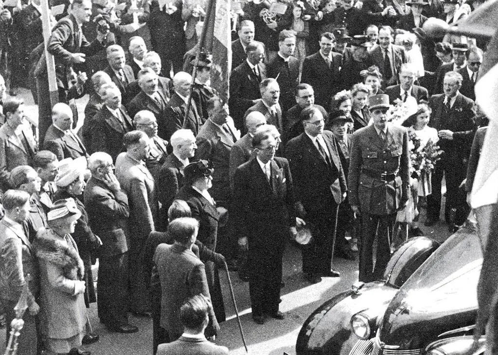 Le 10 juin 1945, le Général de Gaulle est à Tinchebray, place Saint-Remy. Il est accueilli par le maire Albert Ledos, qui se trouve à sa droite. Derrière le Général, il y a le révérend père Fernand Prével et Yvette Dubocq, figure de la résistance. © Photo privée