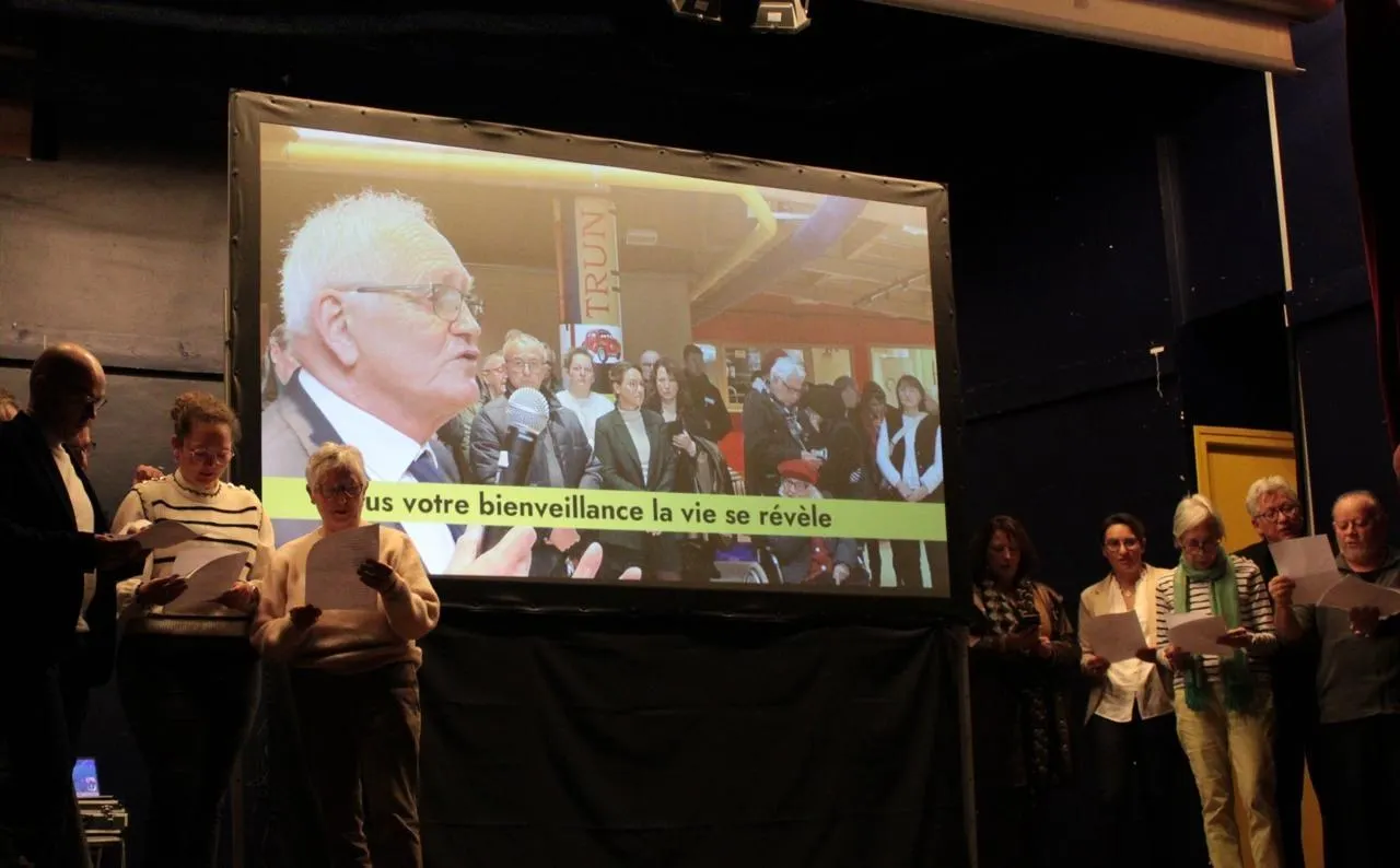 Après la projection du film, les conseillers municipaux, sur scène, chantent une chanson au maire. © Ouest-France