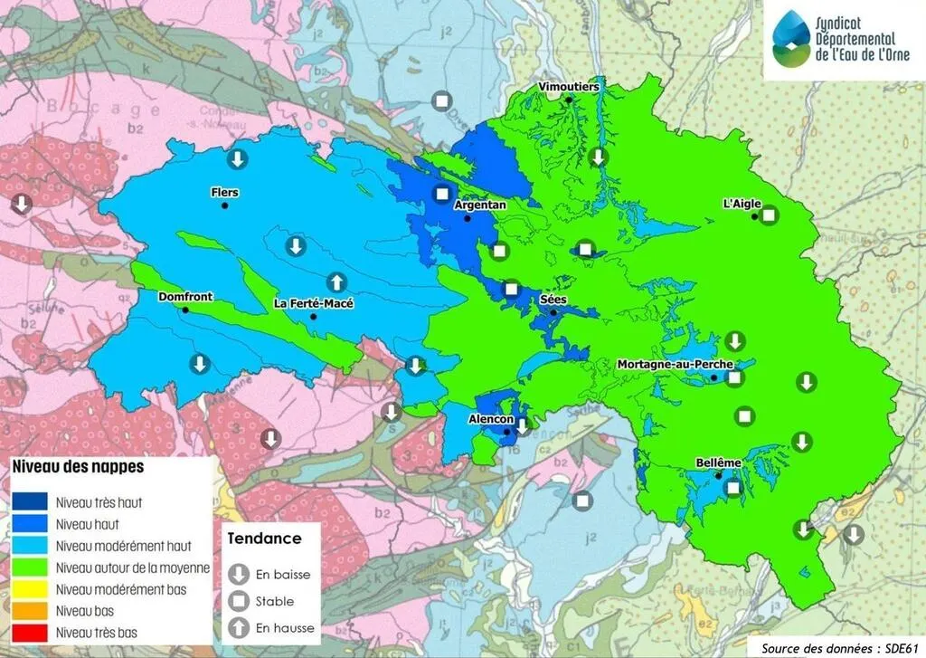 Le niveau des nappes dans le département de l’Orne en mars 2024. SDE61
