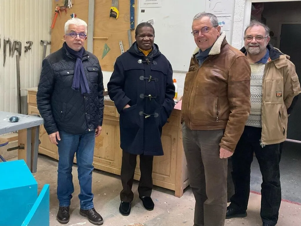 Visite d’un atelier du Centre éducatif fermé avec de gauche à droite le maire, Philippe Bigot, le Père Zorom, le Père Gicquel-des-Touches et Jean-Marc Gagez, diacre. © Ouest-France