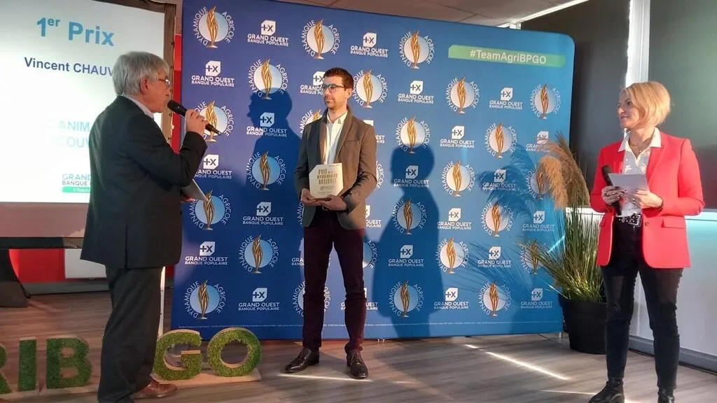 Vincent Chauvin, au centre, reçoit le prix de l’innovation par Jean-Pierre Feret, du conseil départemental, partenaire régulier de l’exploitant et Mélanie Vilboux, directrice à la Banque populaire. © Ouest-France